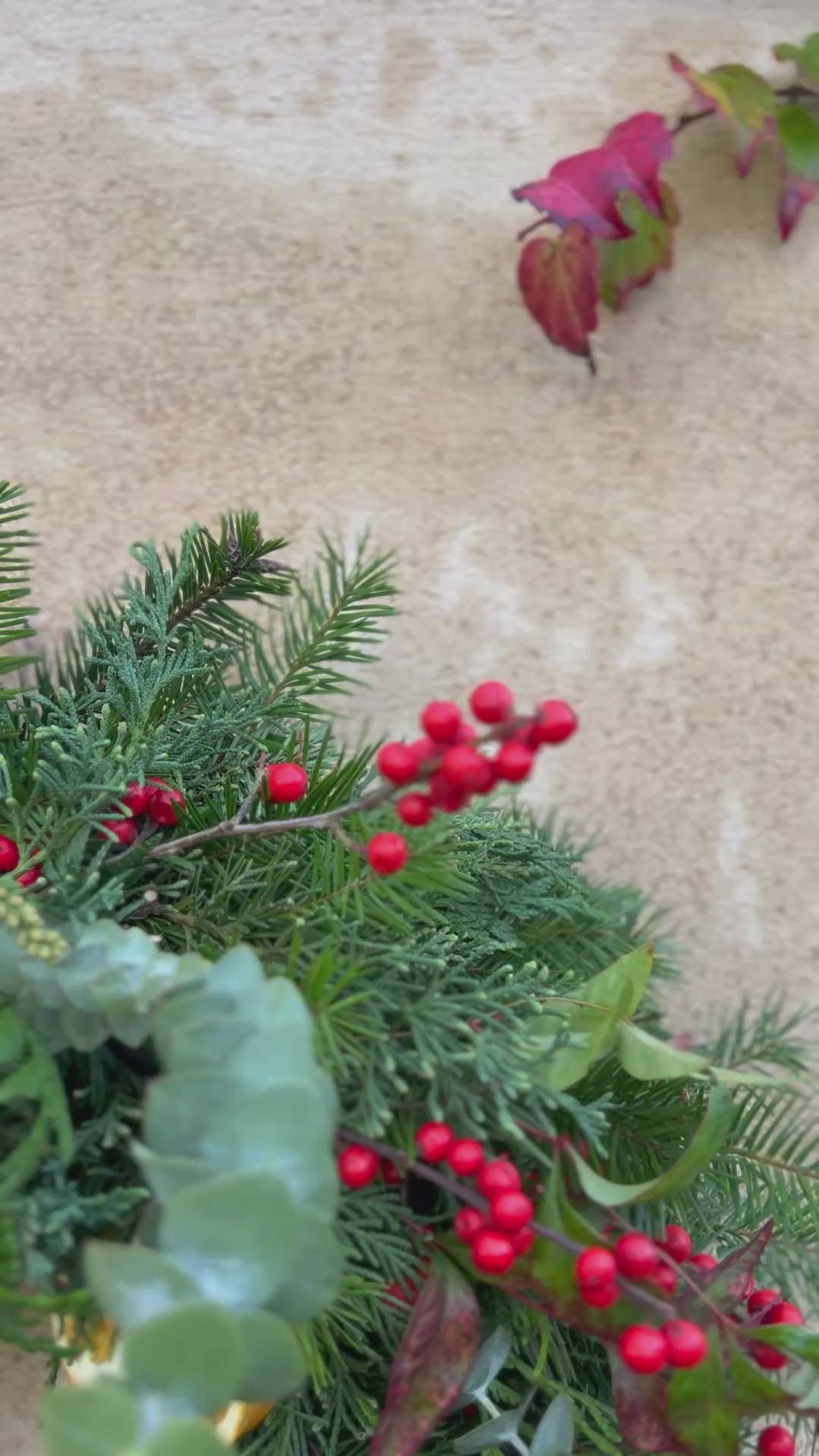 Corona elaborada con una base de abeto, coníferas aromáticas, ciprés, tuyas y eucalipto baby que decoramos con naranjas deshidratadas, ilex y piñas.