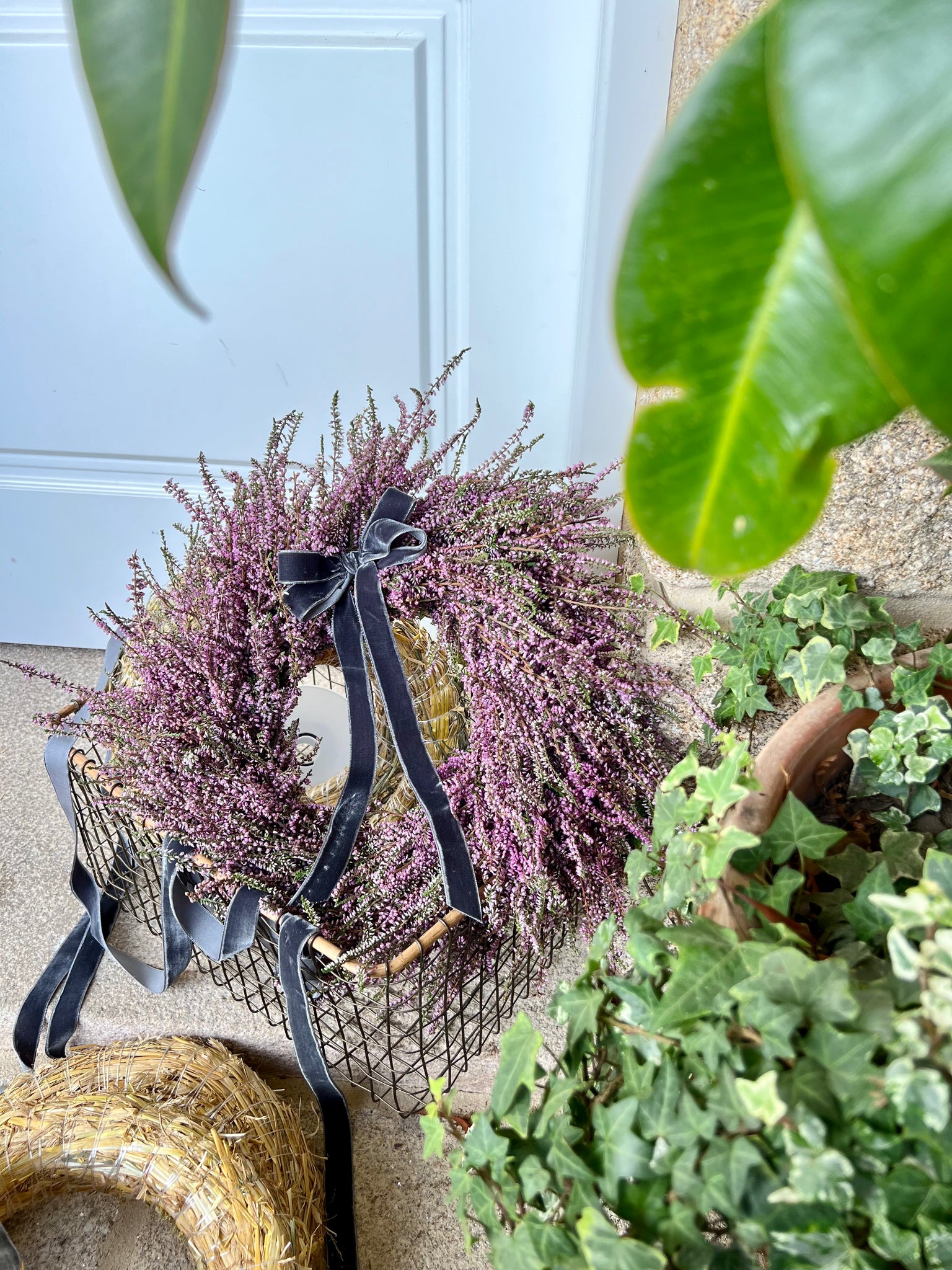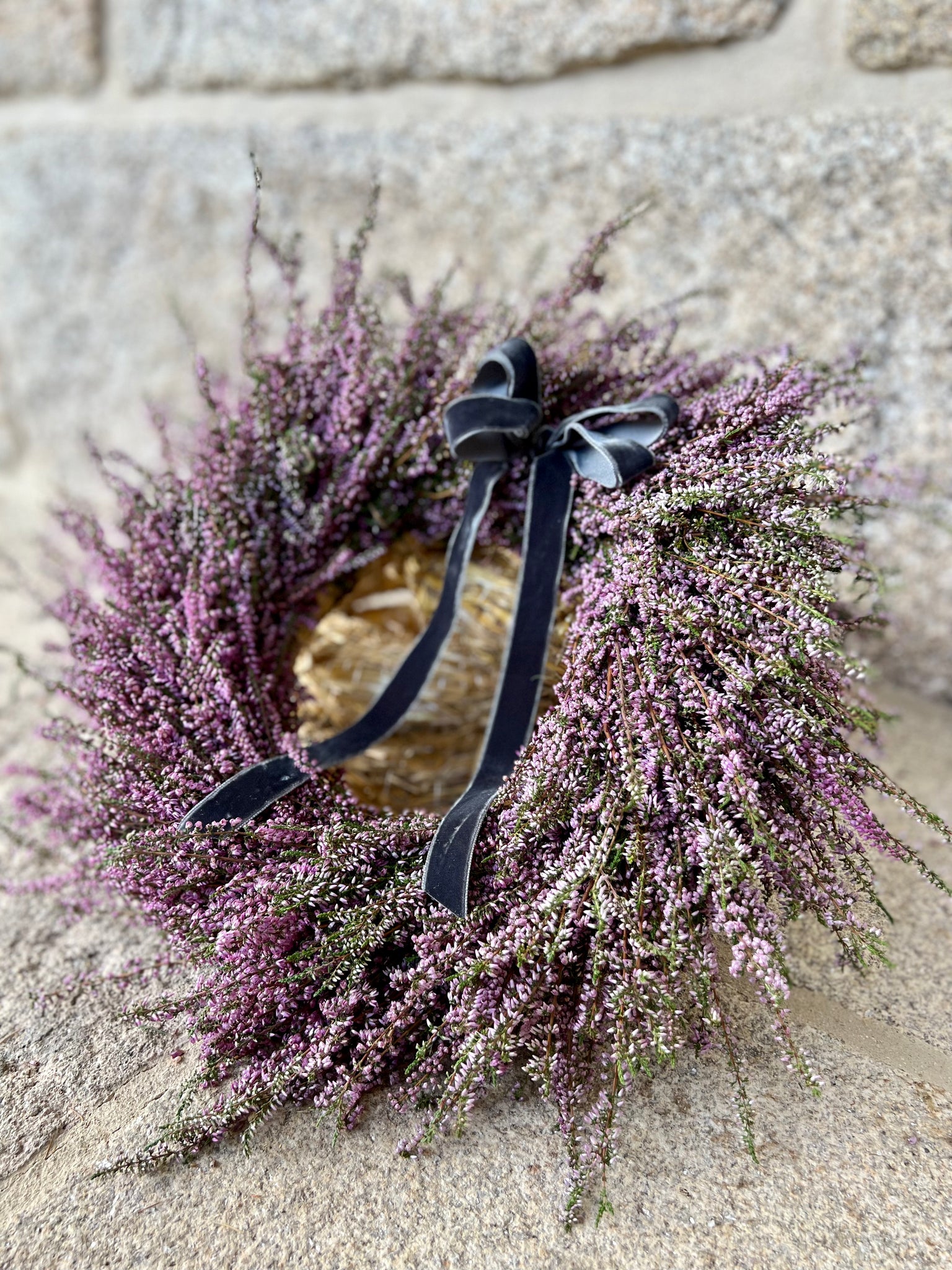 Corona elaborada con flor natural de brezo recogido en los montes gallegos rematada con una lazada doble de terciopelo gris