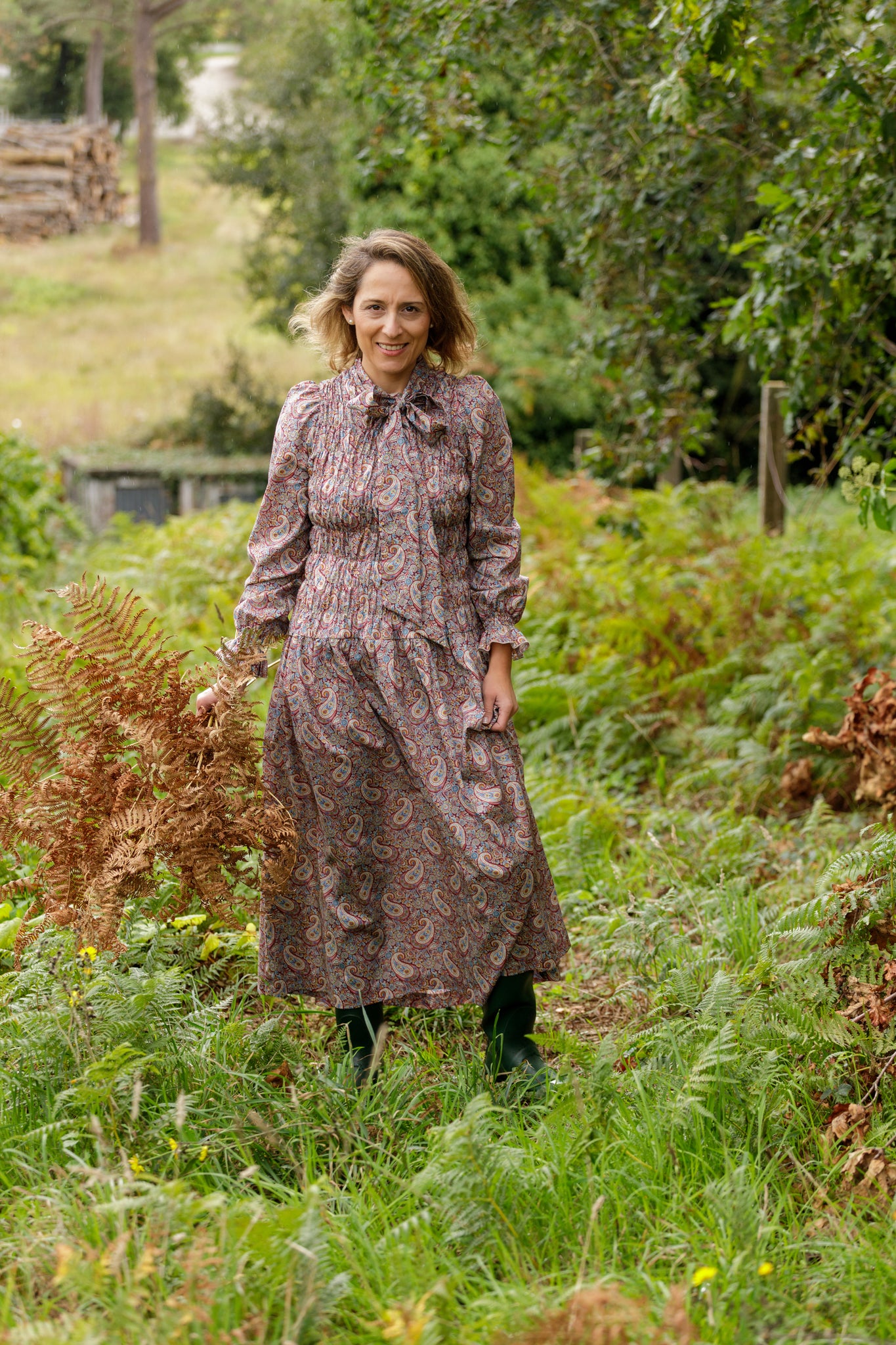 Confeccionado en un precioso tejido Liberty London estampado en tonos granate, azul y ocre, nos encanta el cuerpo fruncido y elástico que se adapta perfectamente a la forma del cuerpo y la lazada del cuello.